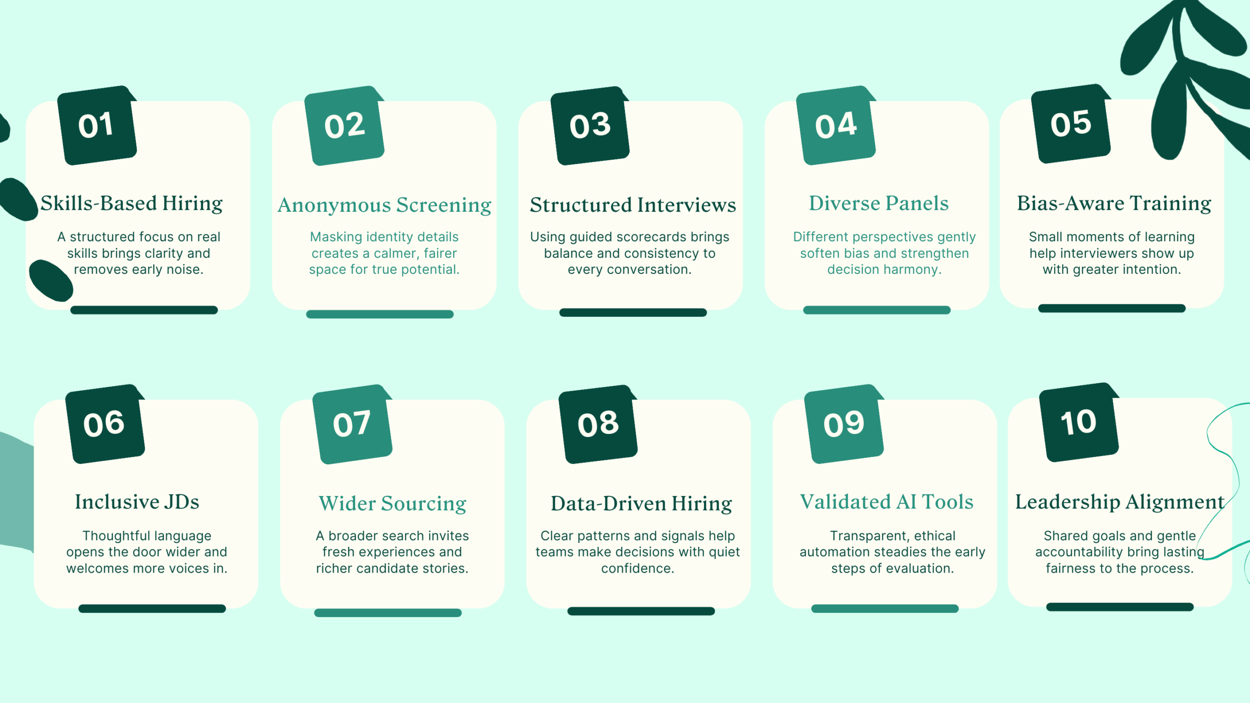 Before we dive deeper, here’s a simple visual overview of the ten practices that anchor a modern, low-bias hiring process.