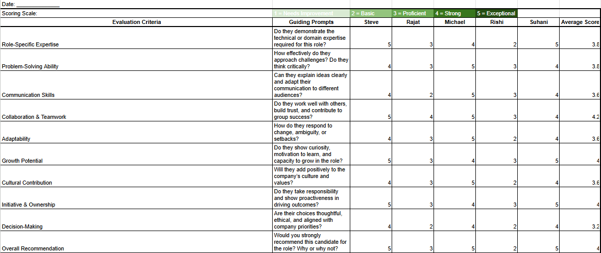 The best way to align everyone is by creating a hiring rubric. A rubric breaks down what matters most for the role and ensures every candidate is evaluated against the same set of criteria.