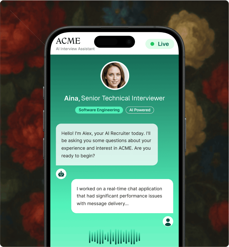 Our models run adaptive, two-way conversations that dig into skills, context and past experience, similar to a senior interviewer. They ask clarifying and follow-up questions, then score answers against a calibrated rubric so you only spend time on the top profiles.